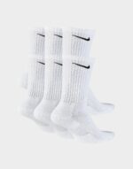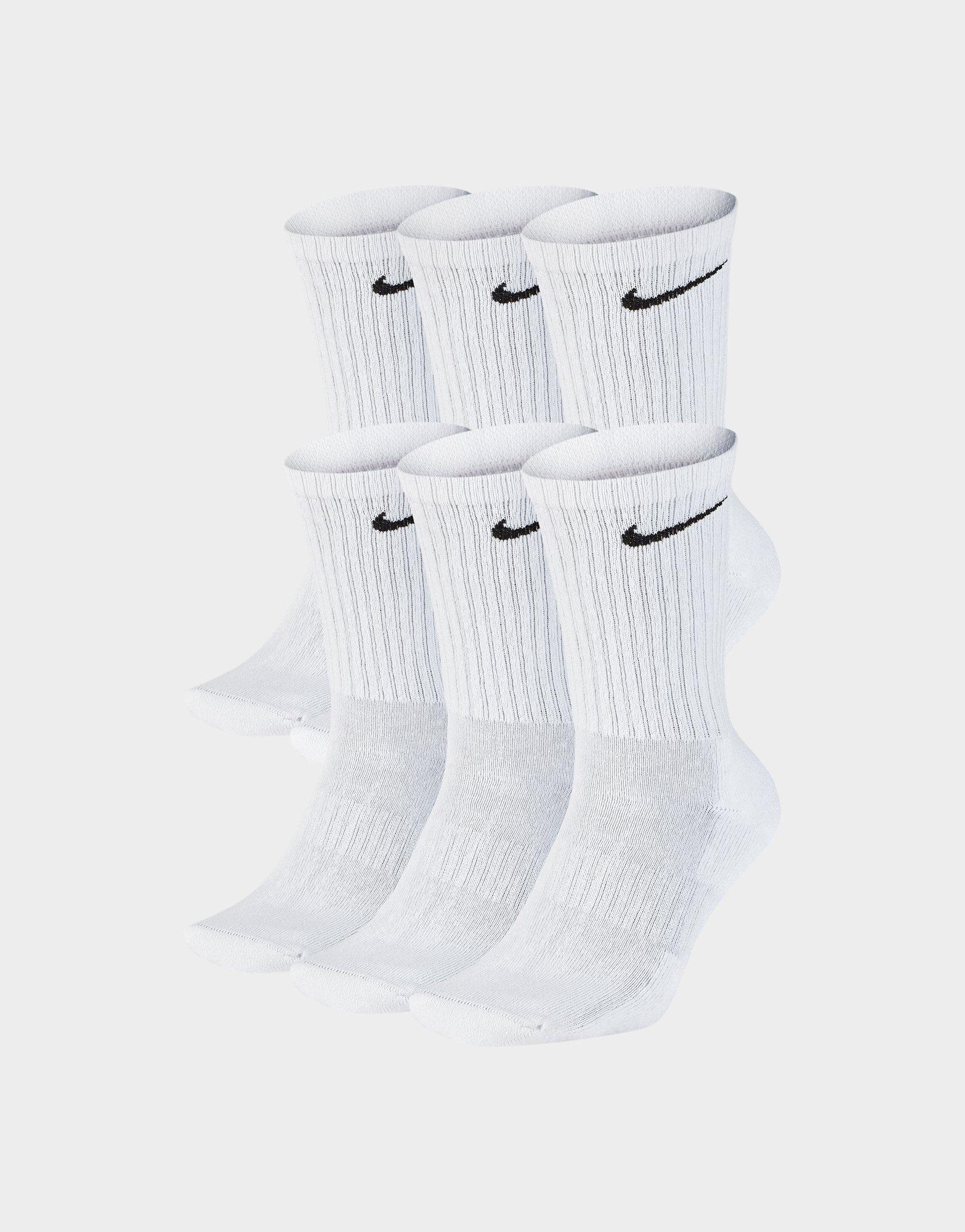 Step out in extra comfort with this 6 Pack of Cushion Crew Socks from Nike. Made from stretchy cotton fabric. these ankle-length socks wick away sweat to keep feet cool and dry. They have ribbed cuffs for a snug fit. and are finished in a white colourway with arch compression. reinforced panels and the iconic Swoosh logo to the cuff in black.