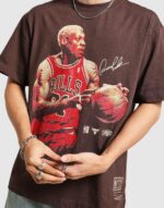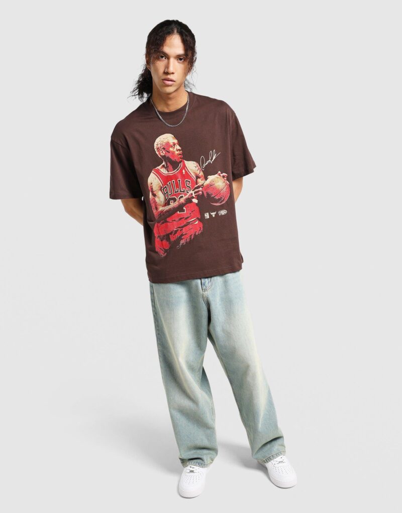 A premium fan tee from Mitchell & Ness celebrating legendary player Dennis Rodman with the Chicago Bulls. The design features a threshold style graphic print. set on a rich brown base for a vintage-inspired look. Crafted from soft cotton for comfortable all-day wear. it’s perfect for fans wanting to bring retro sports vibes into their casual wardrobe.
