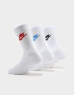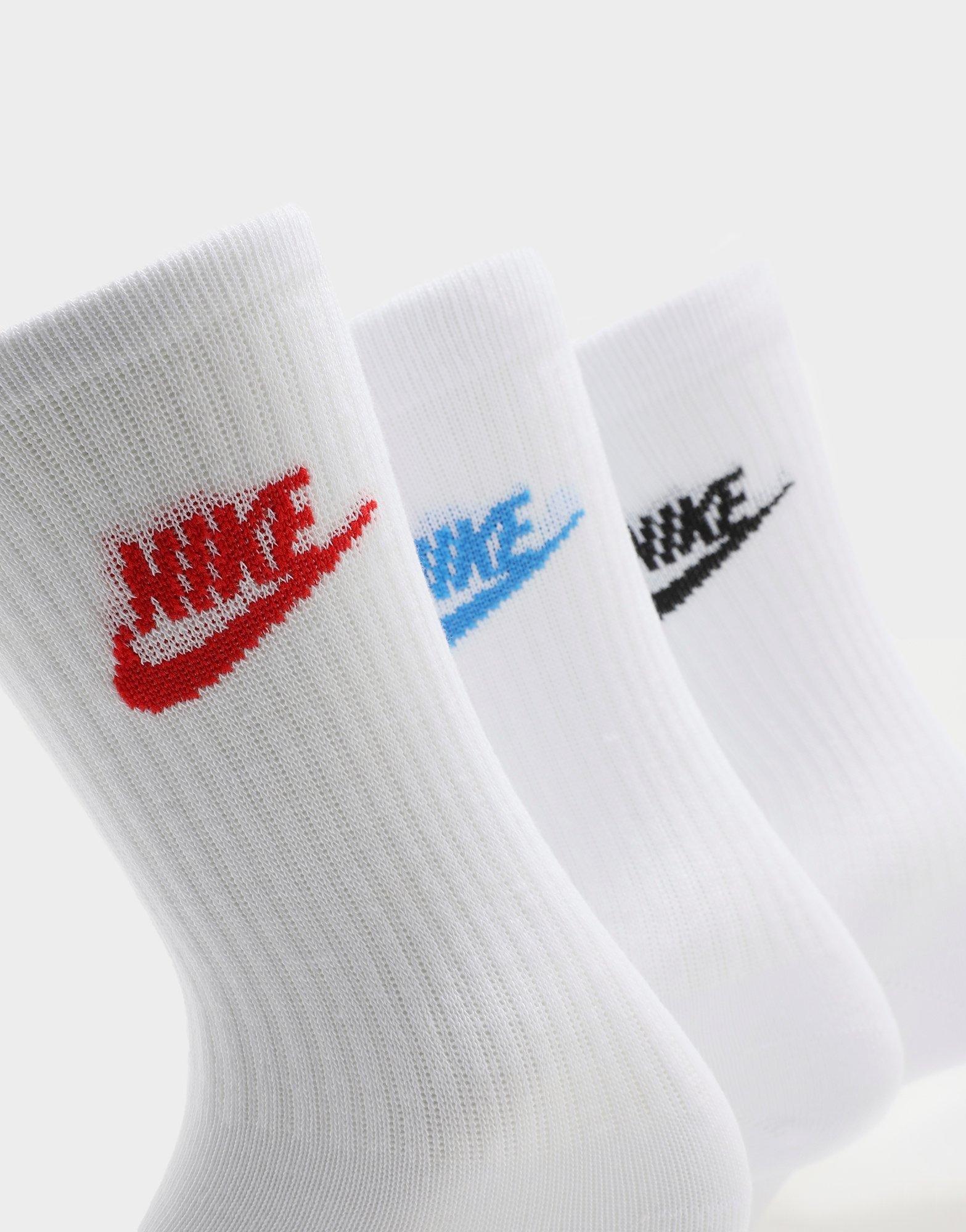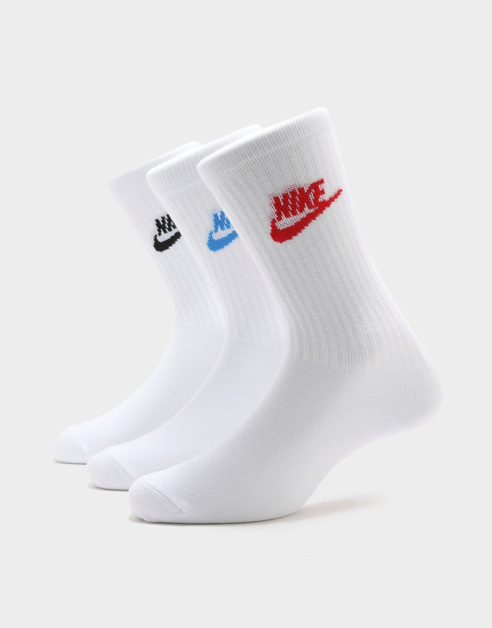 Bring an iconic look to your everyday essentials with these men’s 3 Pack Futura Essential Socks from Nike. In white colourway. these socks are made from a soft yet stretchy poly cotton fabric for a comfy wear all day. With ribbed detailing to the cuffs and middle foot for a secure fit. these socks are finished with multicolour Nike Futura logos to the ankle.