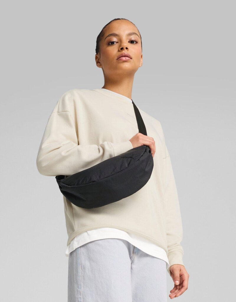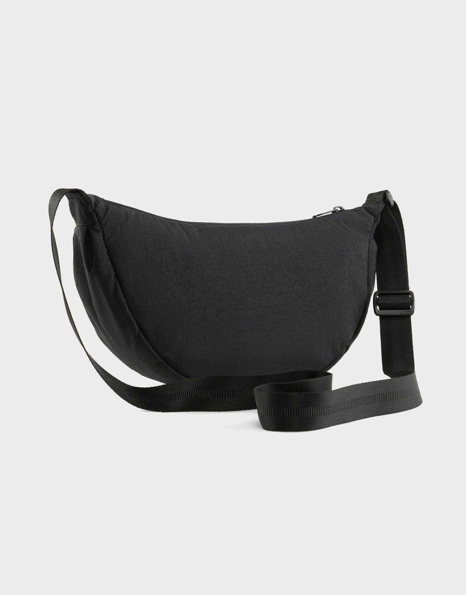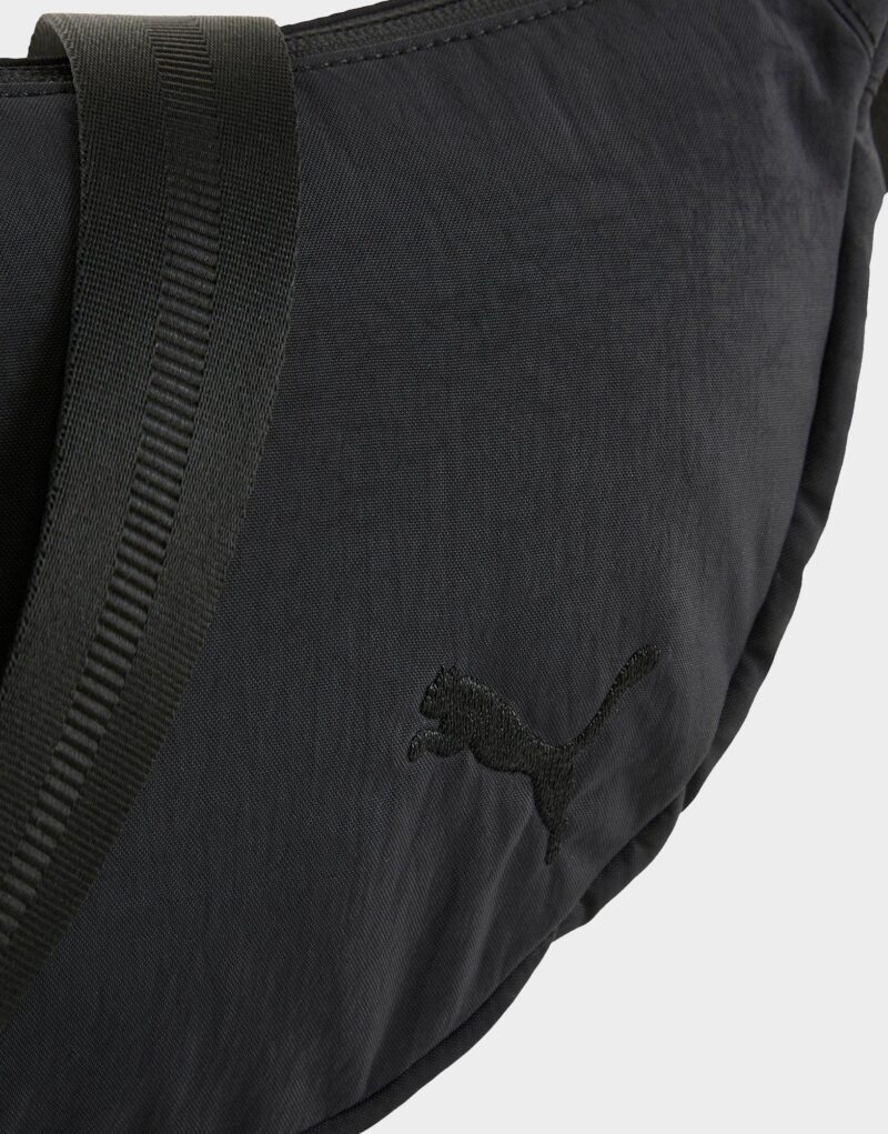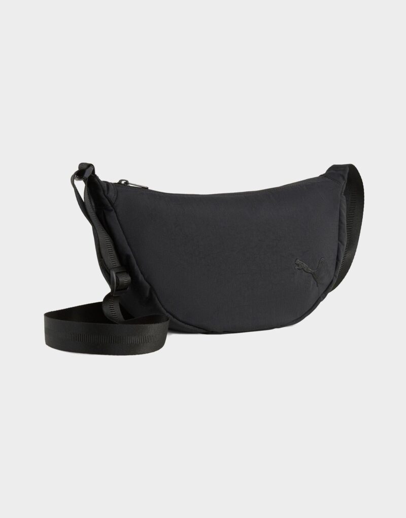 This sleek and versatile bag features a stylish half-moon silhouette. perfect for everyday wear. Crafted in classic Puma Black. it offers a minimalist yet modern look that pairs easily with any outfit. The bag includes a zippered main compartment for secure storage. an internal slip pocket for organization. and an adjustable webbed strap that allows for comfortable crossbody or shoulder carry. Lightweight and functional. it is finished with subtle PUMA branding on the front. making it a go-to accessory for casual outings. travel. or on-the-go style.