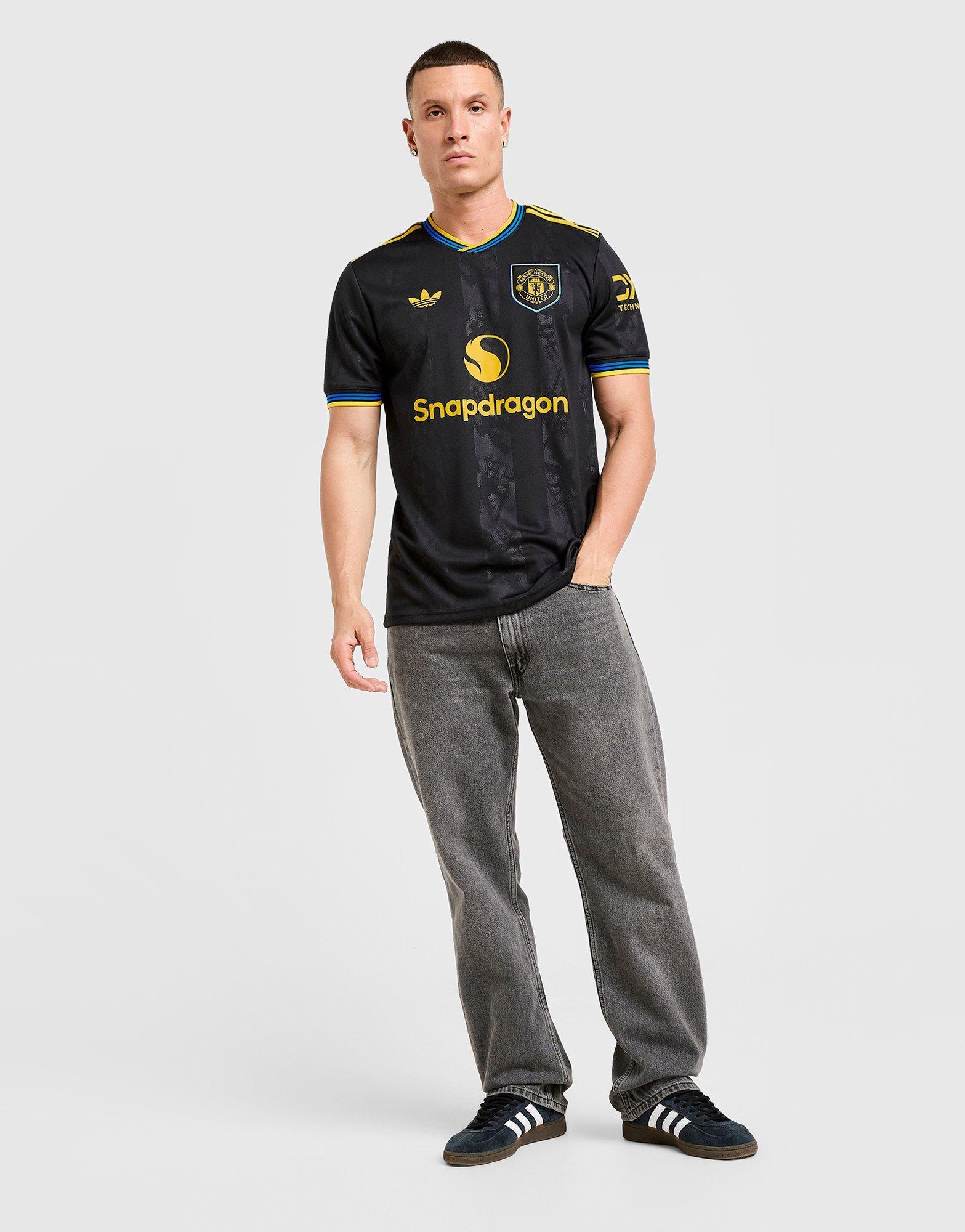 Part of a clean. classic adidas kit that will transport fans to a golden era. Finished in black. this Manchester United third jersey conjures some of the club’s most iconic players and memorable away performances. A yellow Trefoil and club badge stand out on the chest while more subtle. devilish details are woven into the fabric. Moisture-managing AEROREADY keeps fans comfortable while their team create new memories.