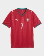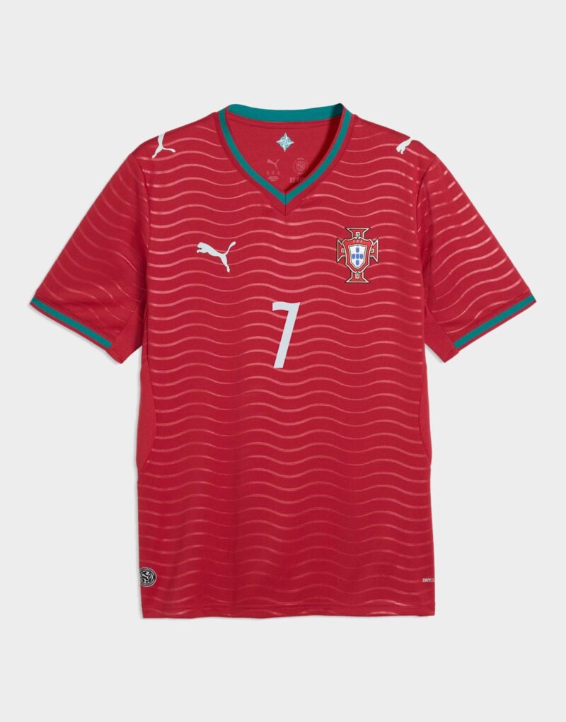 Portugal’s Home Kit channels the energy of the ocean and the intensity of a team ready to make waves on the biggest stage. The iconic red base is layered with a wavy pattern and green accents. a nod to the country’s maritime roots and fearless spirit. It’s a design that speaks to those who were born to explore and live to play por amor à camisola. Designed for the fans. the Replica jersey pairs the same match-worn look with a casual silhouette. details. and materials. ideal for both game day and everyday wear. This version is embellished with players’ names and numbers.