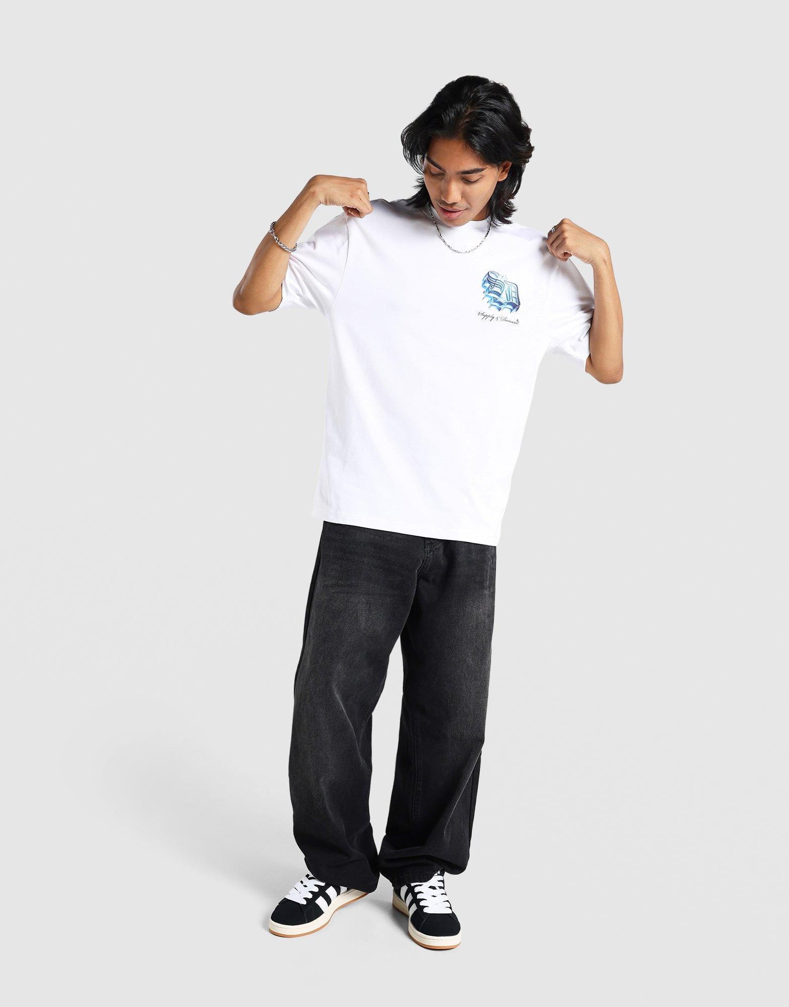 The Supply & Demand Subzero Tee in Optical White delivers a crisp streetwear edge with a clean. minimal aesthetic. Crafted from soft cotton fabric for everyday comfort. this short-sleeve tee features bold Supply & Demand branding across the chest for a standout look. Its relaxed fit and premium feel make it easy to pair with jeans or cargos for effortless urban style.