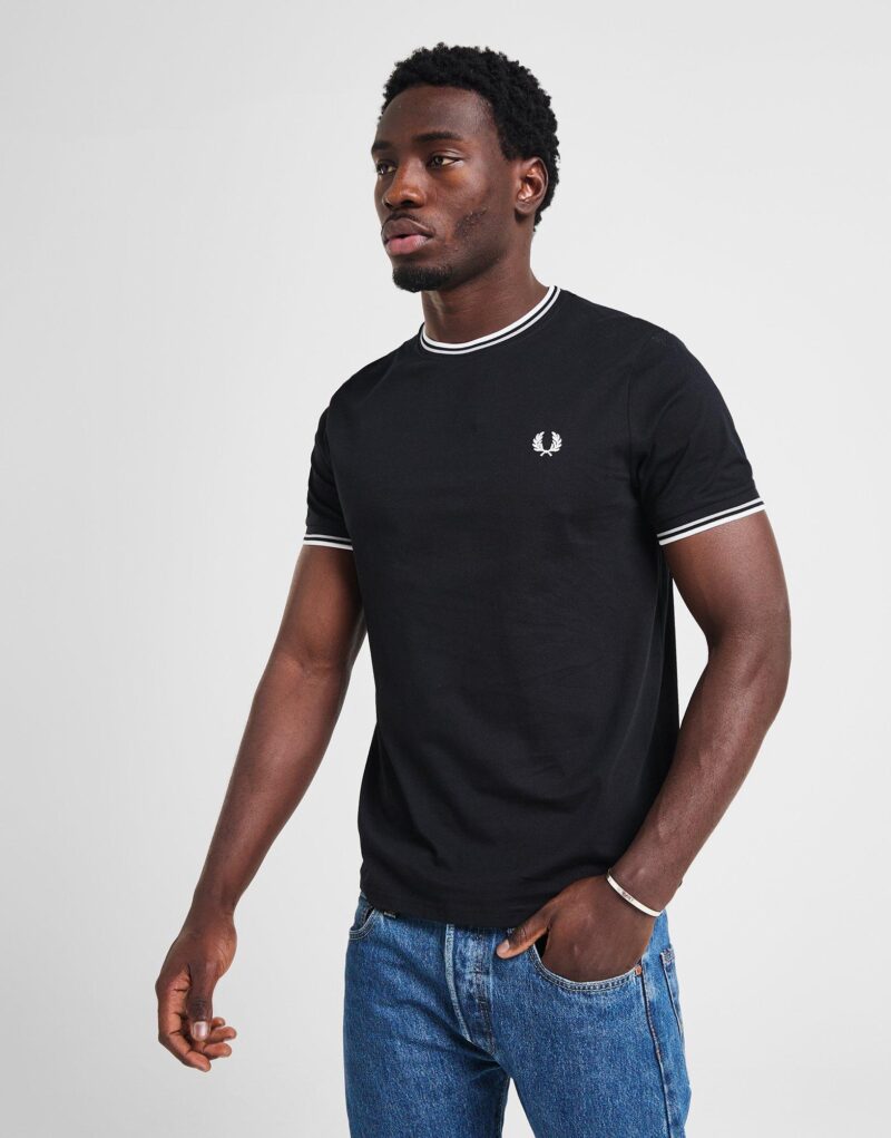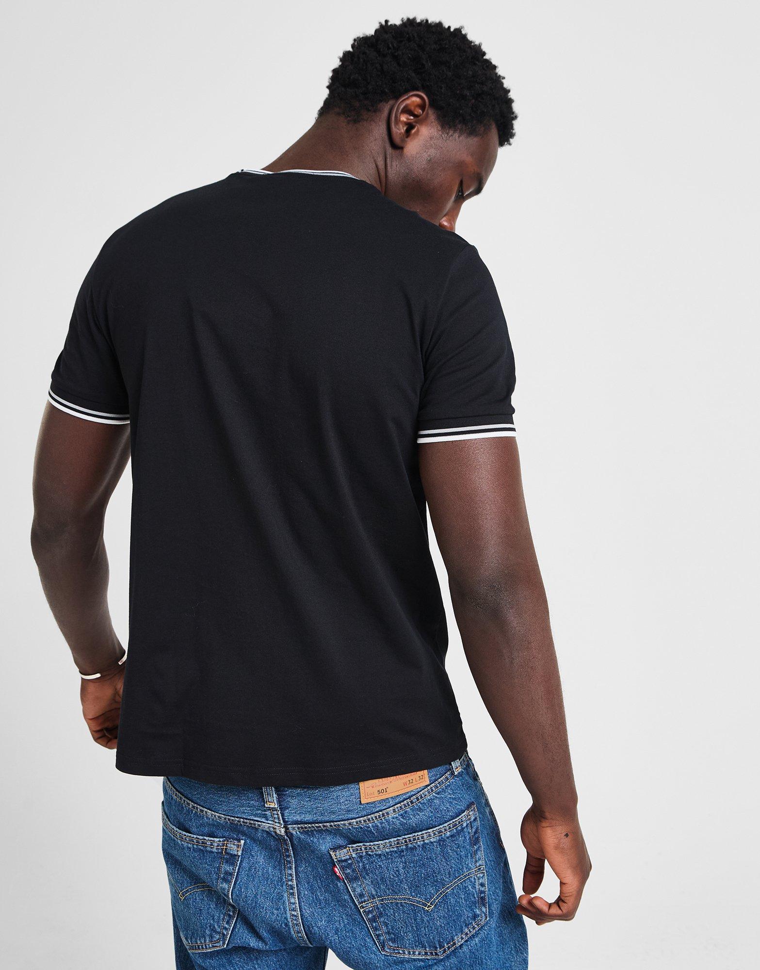 Pull on some premium style with this men’s Twin Tipped T-Shirt from Fred Perry. In a Black colourway with Light Stone accents. this JD-exclusive. regular-fit tee is cut from soft cotton fabric for lasting comfort. It features a ribbed crew neckline and short sleeves with twin tipped detailing for a classic look. and is signed off with an embroidered Laurel Wreath logo to the chest. Machine washable. | Our model is 6’1 with a 36 chest and wears a size M.