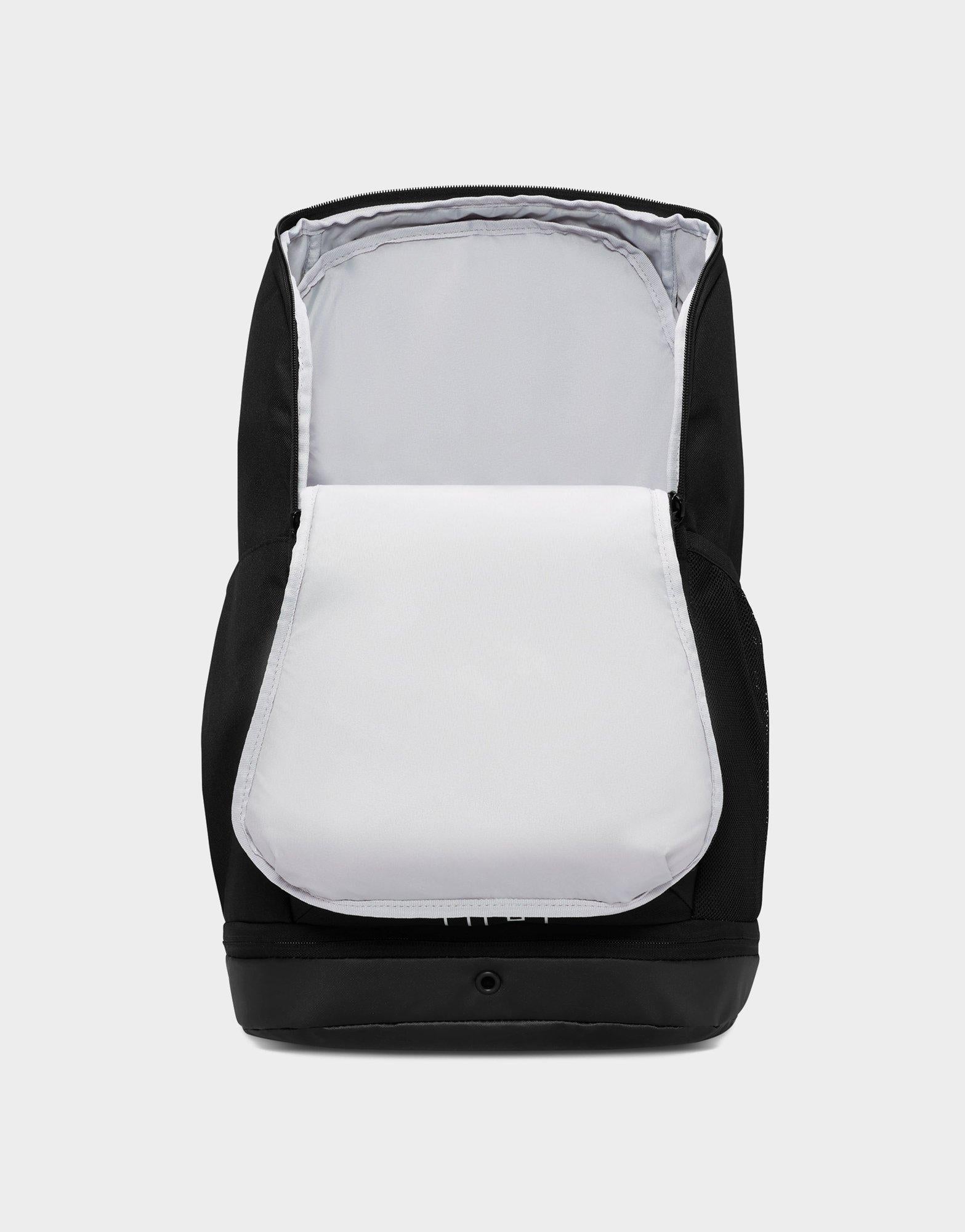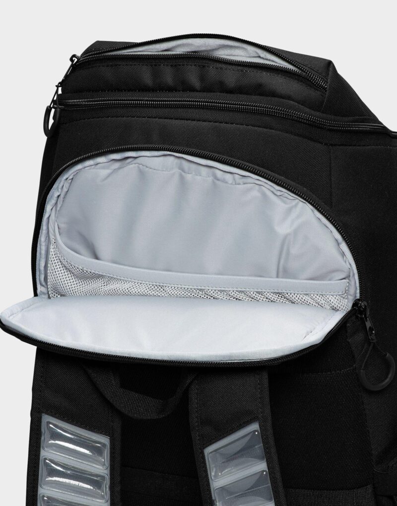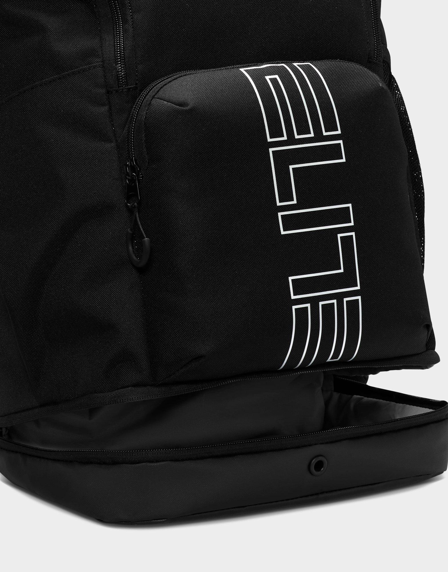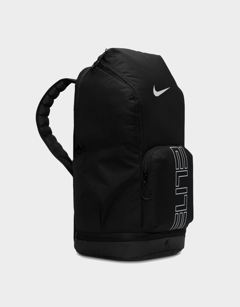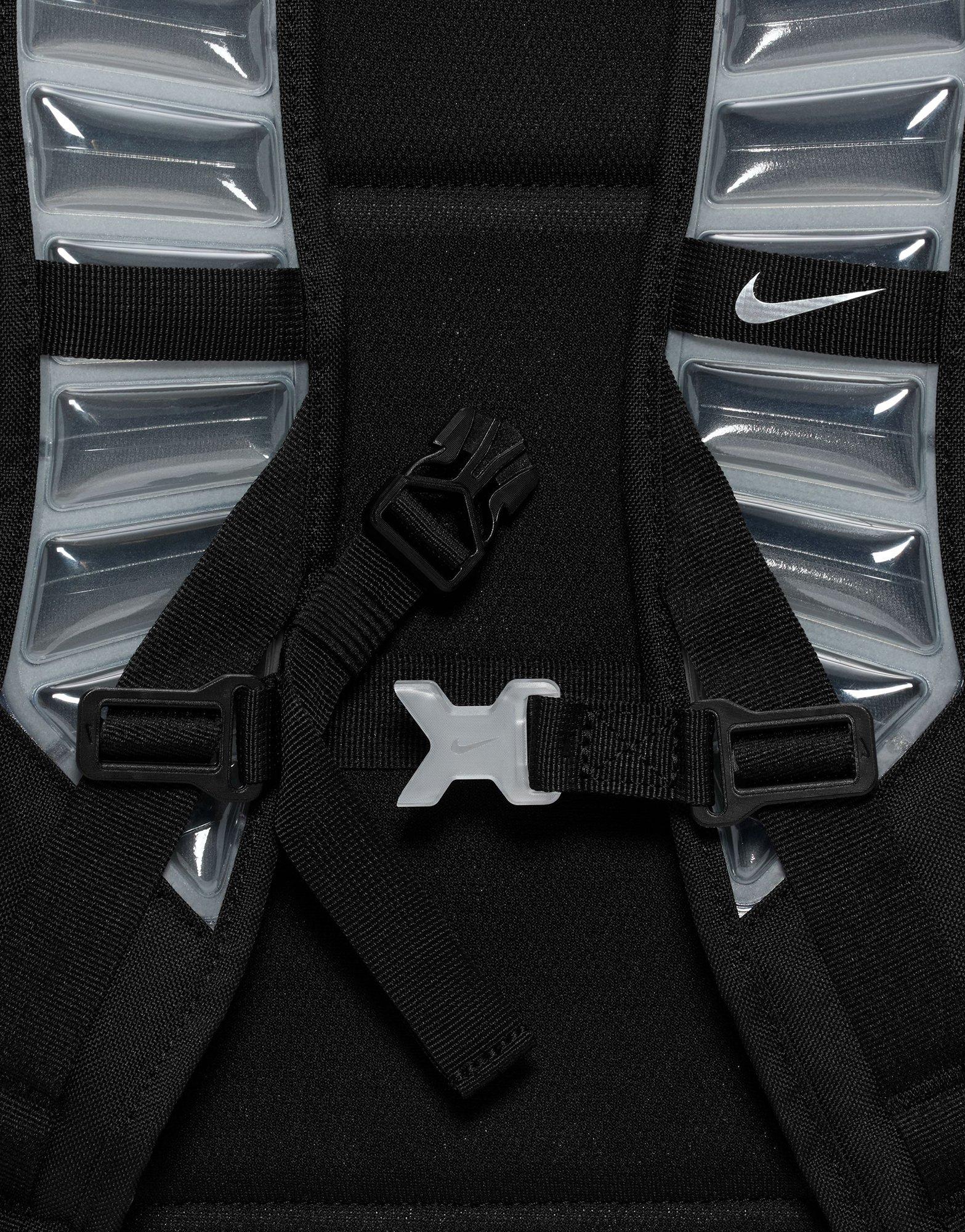 The Nike Varsity Elite Backpack in Black/Black/Silver is a durable and spacious 32-liter bag designed for athletes and everyday use. It features a large main compartment roomy enough to fit a basketball. along with a ventilated lower pocket perfect for separating shoes or used gear. A plush-lined top pocket protects valuables like electronics or sunglasses. while an internal sleeve securely holds laptops up to 16 inches. Air Max shoulder straps and an adjustable chest strap provide superior comfort during long wear. With expandable side bottle pockets. a trolley sleeve for easy travel. and a sleek black-on-black design with silver accents. this backpack combines function and style for on-the-go performance.